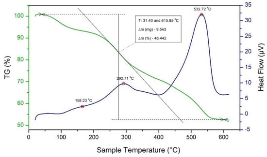Thermogravimetry and differential thermal analysis (TG-DTA) profile of the precursor containing 0.3 mL PEG, dried at 150 °C.