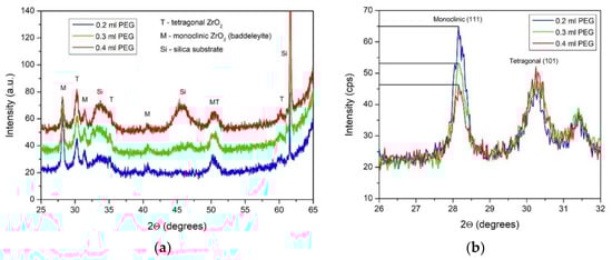 The only difference in the XRD patterns of the samples prepared with different amount of PEG in the precursor is in the intensity of the main monoclinic peak, located at 28.15 degrees (Figure 2b). It is observed that with the increase of the PEG amount, the intensity of the (111) peak decreases. This effect could be explained with the increasing number of carbon atoms that are beneficial to the formation of the competitive tetragonal phase by suppressing the growth of the ZrO2 crystallites under the 30 nm threshold [] and thus decreasing the degree of crystallinity of the monoclinic phase. The size of the crystallites for the different crystallographic phases is summarized in Table 1.