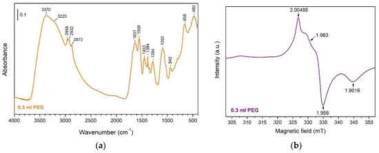 Fourier transform infrared spectroscopy (FT-IR) spectrum of dried precursor with 0.3 mL PEG (a) and EPR spectrum of dried precursor with 0.3 mL PEG (b).