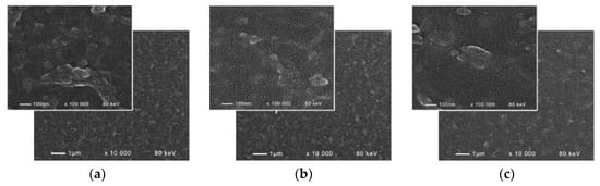 Images revealing the surface morphology of the coatings, obtained with different amounts of polymer, are presented in Figure 4. The thin films are dense and crack-free with uniform morphology and secondary particles with sizes of about 100 nm formed on the coatings surface. The increase of PEG amount in the precursor has some smoothening effect on the films: fewer secondary particles are observed, but their individual size was getting bigger in the sample, obtained from the solution with the highest amount of polymer (Figure 4c). The 0.3 mL PEG coating is both smooth and has small surface particles; the ganglia-like nanostructure of the thin film is best revealed in that sample.
