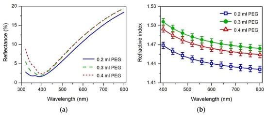 Reflectance spectra of the films measured at normal light incidence are presented in Figure 5a. It can be seen that in the visible spectral range (λ = 400–800 nm) R-spectra for samples with 0.3 mL and 0.4 mL PEG are similar and start to deviate from each other at shorter wavelength (λ < 430 nm). This means that insignificant difference in thicknesses and optical constants for ZrO2 films with 0.3 mL and 0.4 mL PEG is expected. The reflectance values of 0.2 mL PEG sample are smaller in the entire spectral range as compared to other samples; thus, some difference in n and d could be expected. Generally, the difference between samples is stronger for shorter wavelengths. The measured spectra are used for simultaneous determination of refractive index (n), extinction coefficient (k) and thickness (d). In order to obtain more reliable data, the UV part of R-spectra is not considered in the calculation. Thus, the negative effect of the possible scattering has been ignored to the great extent.