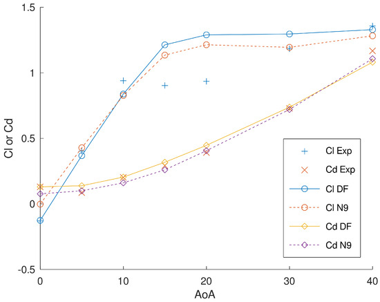 Angle of attack study for the corrugated wing (DF) compared to the NACA0009 aerofoil (N9).