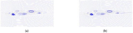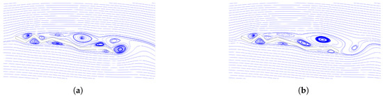 Velocity streamlines at AoA = 10 degrees for (a) time step = 6.6 s and (b) time step = 6.7 s.
