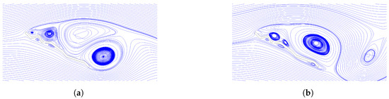 Velocity streamlines at AoA = 30 degrees for (a) time step = 6.46 s and (b) time step = 6.6 s.