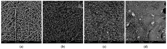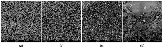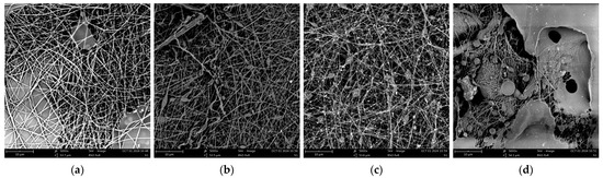 Scanning electron microscopy (SEM) images of as-spun samples: (a) PAN; (b) PAN/TEOS; (c) PAN/ZnO; (d) PAN/nickel ferrite.