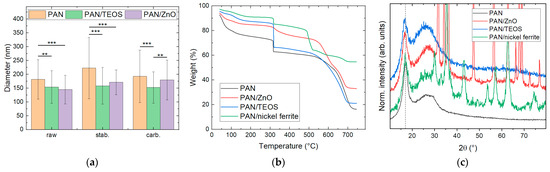 The nanofiber diameter distribution for the three fibrous samples is depicted in Figure 4a. PAN/TEOS keeps the diameter mostly constant, which seems to make it advantageous for stabilization and carbonization. TGA measurements (Figure 4b) show a steep decrease in sample mass due to the cyclization of nitrile groups at around 300 °C, which is increased by TEOS and reduced by ZnO. XRD measurements of the as-spun nanofiber mats (Figure 4c) reveal, besides the PAN diffraction peak at 17°, no contribution from the amorphous TEOS and the typical sharp peaks of ZnO nickel ferrite, respectively.