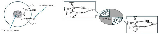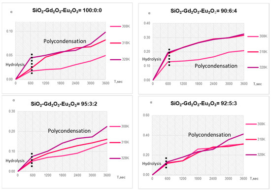 The activation energy of the hydrolysis process depends on the concentration of Gd2O3-Eu2O3 oxides and varies in the range of 17.65–6.03 kJ/mol. The maximum value of the activation energy is 17.65 kJ/mol for the system with the absence of rare earth elements (SiO2:Gd2O3:Eu2O3 = 100:0:0). The addition of Gd3+ and Eu3+ ions reduces the activation energy of silicon oxide formation from tetraethoxysilane. So, these ions play the role of catalysts. The response degree of stage of hydrolysis increases from 2% to 20% with an increasing concentration of Gd2O3-Eu2O3. Therefore, the rate and completeness of hydrolysis increases with the increase in rare earth elements oxide content. The degree of the response stage of polycondensation also increases with the increasing content of Gd2O3-Eu2O3, but does not reach 100%; this is due to the fact that in the process of transformation, hydrated gadolinium and europium ions are located on the surface of silicon oxide particles, and shield these particles from further deposition. That is, in the process of heterogeneous hydrolysis, a layered structure was obtained: in the center is a Si(OH)4 nucleus, then a polymer layer of Si-O-Si, and then a layer of hydrated metal ions, which after firing turns into the oxides Gd2O3 and Eu2O3. The concentration of major activity centers differs markedly when using different drying and synthetic methods. The best results are obtained using the Lyophilic drying method and a synthetic system.