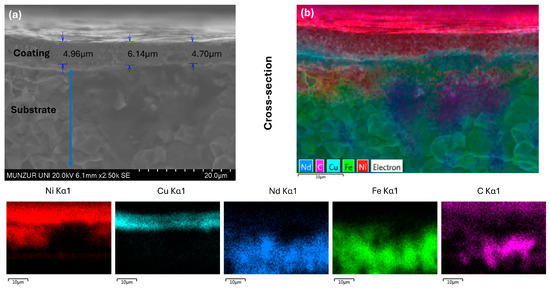 Figure 1 shows a cross-sectional SEM image of Ni-Cu-coated NdFeB alloy, where a complete coating is evident, with a layer thickness of approximately 5 μm. The Ni-Cu plating layer thoroughly covers the sintered NdFeB alloy, demonstrating that the plating effectively protects it. The Ni-Cu plating layer is generally uniform and dense, ensuring a solid foundation for the subsequent layers. The Ni-Cu coating appears uniform, free of cracks, and shows no signs of peeling. EDS mapping analysis indicates that the surface of the NdFeB alloy consists of a Ni-Cu region. The Ni-Cu coating film was dense and well-adhered to the substrate. It can be concluded that copper did not significantly dissolve the Nd-rich phase, which is beneficial for preserving the magnetic properties [8]. Also, it could be said that the Ni-Cu-coated magnet demonstrated adequate adhesive coverage and strong adhesion [11].