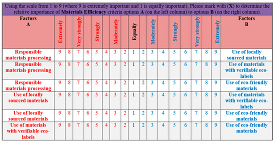 The study aims to develop a comprehensive, nature-inspired, sustainable framework for assessing green building projects. To achieve this aim, this paper specifically explores the role and significance of materials efficiency (ME) within the conceptualised nature-inspired sustainability assessment framework. The framework identifies, examines, organises, and determines the relative importance of the core ME category for evaluating the sustainability performance of buildings in South Africa, which can be adapted globally as well. To achieve the aim of this study, the ME aspect of the framework is assessed. A standardised self-administered pairwise questionnaire survey was administered to active sustainability experts and professionals in the South African construction sector. These respondents include architects, construction project managers, project managers, civil engineers, quantity surveyors, mechanical engineers, industrial engineers, town/urban planners, electrical engineers, and construction managers. These experts/professionals are experienced and registered with their respective professional bodies. They have also executed and participated in green-rated building projects in South Africa. The instructions and explanations preceding the questions were kept simple and clear enough for easy comprehension by the respondents (decision-makers). Figure 2 shows the content and design of the pairwise questionnaire. The experts used the provided Saaty number scale of 1–9 to rate the importance of the items against each other and to allocate weights in pairwise comparisons. Where 9 is extremely important and 1 is equally important, the experts were asked to mark with (X) to determine the relative importance of materials efficiency criteria options A (ME1, ME1, ME1, ME2, ME2, and ME3) on the left column to options B (ME2, ME3, ME4, ME3, ME4, and ME) on the right column. Of the fifty (50) experts/respondents (decision-makers) identified and sampled, a total of thirty-eight (38) completed questionnaires were received and analysed, representing a 76% response rate.