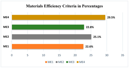 The weights of the ME criteria were rounded to the nearest integer for simplicity and practical use [28]. From Figure 3, it can be inferred that the use of the eco-friendly materials criteria (ME4) contributes the highest weighting of 30% to the goal (materials efficiency category), the use of locally sourced materials criteria (ME2) contributes 25%, and the use of materials with verifiable eco-labels (ME3) contributes 23%. In comparison, the least contribution of 23% was attributed to the responsible materials processing criteria (ME1).