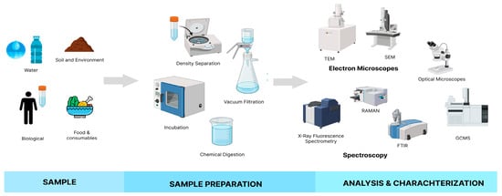 The investigation aimed to detect, isolate, and characterize MP particles through an integrated experimental protocol combining chemical digestion, physical separation, thermal exposure simulation, and advanced instrumental analysis to achieve this. The integrated workflow (Figure 1) outlines the stepwise procedure, from sample collection to spectroscopic and chemical analysis, ensuring the reliable detection of contaminants and supporting health risk assessments linked to packaging-related pollution.