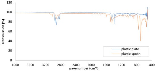 FTIR spectroscopy was utilized to analyze the chemical makeup and potential impurities of a plastic plate and a plastic spoon (Figure 2). Both items display significant absorption bands around 2950, 2920, and 2850 cm−1, which are indicative of asymmetric and symmetric C–H stretching in aliphatic hydrocarbons, suggesting that they are primarily composed of polyolefins such as PE or PP. Nevertheless, noticeable spectral differences reveal chemical distinctions between the two plastics. The sample exhibits a distinct absorption peak near 1740 cm−1, corresponding to C=O stretching vibrations typically associated with ester or ketone groups. This indicates the presence of additives, degradation products, or potential contamination. Additional bands in the 1250–1000 cm−1 range, associated with C–O stretching, further support the presence of processing additives or surface residues. These features are commonly associated with oxidative degradation and polymer breakdown, which are early indicators of MP formation. In contrast, the plastic plate spectrum lacks these carbonyl and ester-related peaks, suggesting a simpler composition with fewer chemical alterations. These differences indicate that the spoon has undergone more significant chemical changes and may contain oxidation products, food residues, or plasticizers, making it more susceptible to additive leaching and fragmentation into MPs under environmental stress, such as heat, light, or mechanical abrasion.