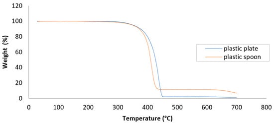 TGA curves of plastic plates and plastic spoons, highlighting their thermal degradation behavior.