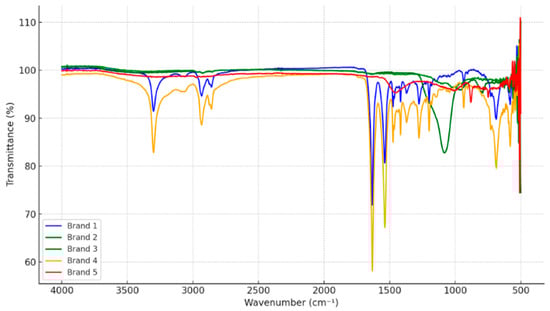 FTIR analysis was conducted on MP particles extracted from five different commercial salt brands to determine the polymeric makeup of the contaminants (Figure 4). The spectra displayed distinctive absorption bands that correspond to widely used synthetic polymers. The presence of PET was identified by specific peaks around 1710–1740 cm−1 (C=O stretching) and 1240–1100 cm−1 (C–O stretching). High-Density Polyethylene (HDPE) was identified by peaks at approximately 2915 and 2849 cm−1 (C–H stretching) and bending modes at 1460 and 720 cm−1. Furthermore, PP was detected, exhibiting characteristic bands near 2950, 2918, and 2838 cm−1 (C–H stretching), along with CH3 bending vibrations at 1454 and 1375 cm−1. The variation in peak intensity across the spectra indicates differences in polymer concentrations and potential compositional complexity among the brands. Overlapping absorption features in the 1000–1500 cm−1 region suggest the presence of multiple polymer types within individual samples. These results confirm that commercial salts are contaminated with MPs originating from packaging and processing materials, mainly composed of PET, HDPE, and PP.