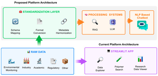 Architecture of the MP data integration platform developed by the authors. The diagram illustrates the modular structure of the system, including data ingestion, standardization, user interface components, and analytical tools designed to support microplastic data exploration and interpretation.