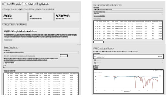 User interface displaying key features of the MP data platform developed by the authors. The interface includes modules for dataset exploration, polymer search, FTIR spectrum analysis, and dashboard metrics, all integrated into a streamlined and user-friendly web application.