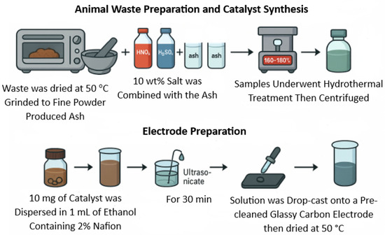 Initially, animal waste was dried at 50 °C, ground into a fine powder, and then incinerated to produce ash, which was subsequently purified to eliminate inorganic impurities. For the catalyst synthesis, 10 wt% salt was combined with the ash, and nitric and sulfuric acids were added in a 3:1 ratio. Four different samples were prepared as follows: Tube 1 contained 2 g of ash with 10 mg of Cu and 10 mg of Ni, Tube 2 had 2 g of ash with 20 mg of Cu, Tube 3 included 2 g of ash with 20 mg of Ni, and Tube 4 served as a control with only ash. All samples underwent hydrothermal treatment at temperatures ranging from 160–180 °C under high pressure. Following this treatment, the liquid and solid phases were separated using centrifugation, and the liquid phase was washed and adjusted to a pH of 7. For electrode preparation, 10 mg of the catalyst was dispersed in 1 mL of ethanol containing 2% Nafion, ultrasonicated for 30 min, and 5 µL of the resulting ink was drop-cast onto a pre-cleaned glassy carbon electrode then dried at 50 °C for testing in the hydrogen evolution reaction (Figure 1).