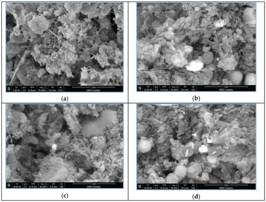 SEM was employed to investigate the morphology and surface characteristics of the materials. The SEM images highlighted critical aspects such as particle size, distribution, and surface texture, which play a significant role in the catalytic performance during HER. The SEM image of untreated biochar (Figure 2a) showed a rough and porous surface, indicative of its carbon-based nature and substantial internal surface area. These porous structures are vital, as they act as potential active sites for catalytic reactions, which are advantageous for hydrogen production applications. Conversely, the SEM image of biochar infused with nickel (Ni) (Figure 2b) showed small, bright spots, signifying the presence of nickel particles that might partially obstruct or fill some of the pores. This change in pore structure can affect mass transfer and the overall efficiency of the catalyst. The SEM image of biochar with copper (Cu) (Figure 2c) displayed distinct bright areas, representing copper-based agglomerates. These agglomerates can influence the accessibility of the pores and the distribution of active sites. The interaction between the biochar matrix and copper particles may also alter the electron transfer properties, potentially enhancing catalytic performance under certain conditions. Finally, the SEM image of biochar containing both Cu and Ni (Figure 2d) showed mixed granules, suggesting that the two metals either co-locate or form separate clusters. The dual-metal deposition can create synergistic effects, enhancing porosity, surface chemistry, and catalytic efficiency.