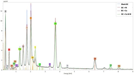 EDX analysis for blank biochar with porous surface, Ni-doped sample showing dispersed metal clusters, Cu-doped surface with visible agglomerates, and Cu-Ni co-doped biochar with mixed granules indicating synergistic effects.