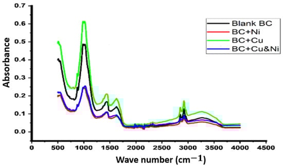 FTIR spectra of pristine biochar (blank BC) and metal-loaded biochar catalysts (BC+Ni, BC+Cu, BC+Cu&Ni), showing changes in functional groups and evidence of metal–surface interactions.