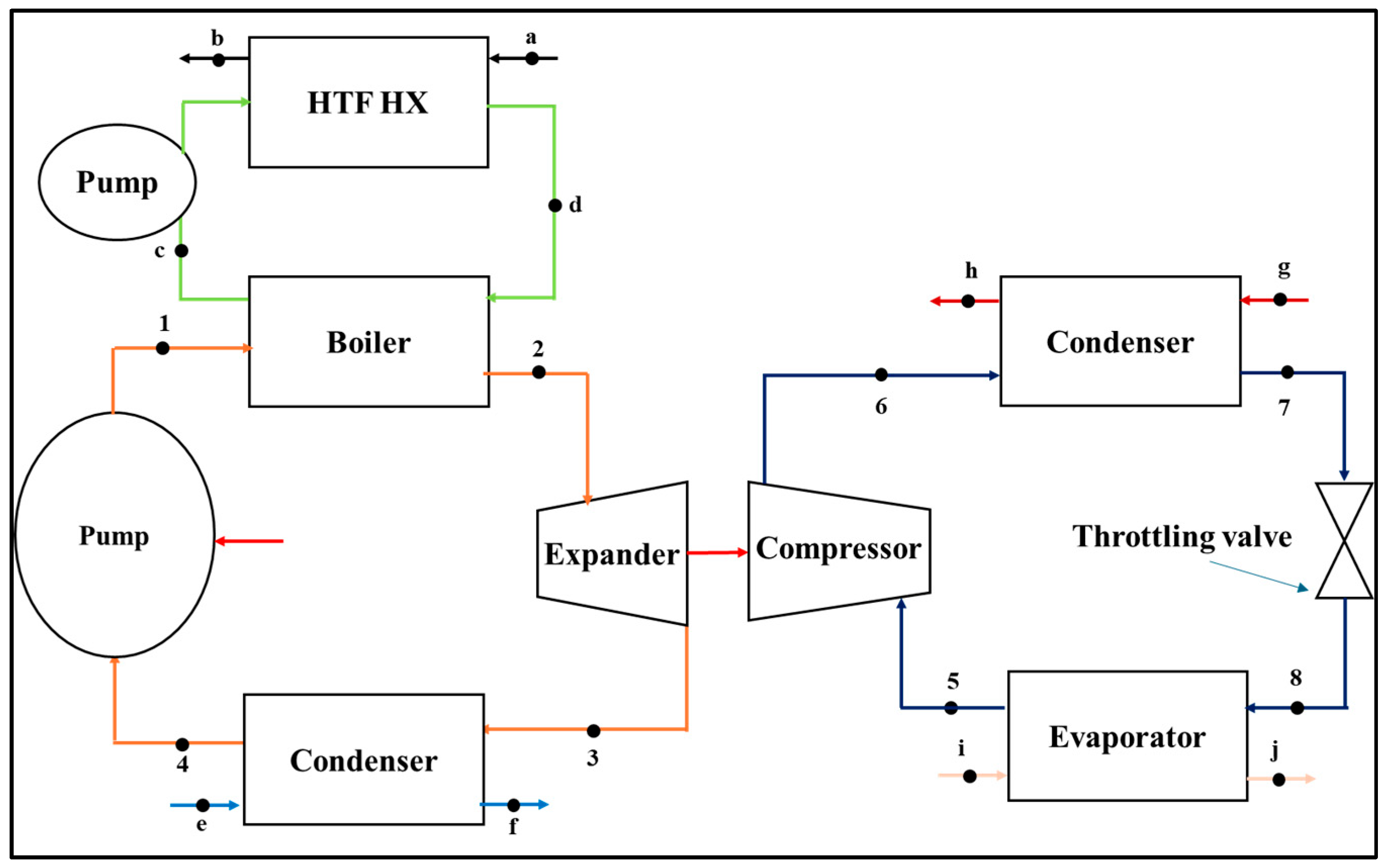 - Wang, H.; Peterson, R.; Harada, K.; Miller, E.; Ingram-Goble, R.; Fisher, L.; Yih, J.; Ward, C. Performance of a combined organic Rankine cycle and vapor compression cycle for heat activated cooling. Energy 2011, 36, 447–458. [Google Scholar] [CrossRef]