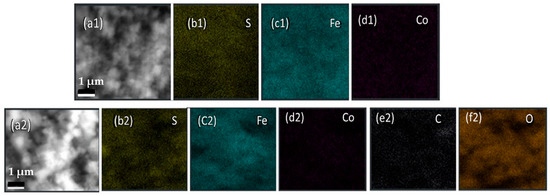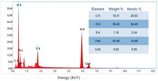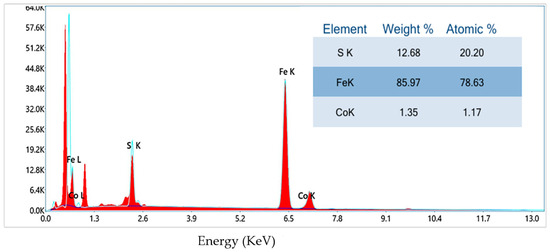Figure 4) exhibited characteristic peaks for iron, cobalt, and sulfur, confirming its formation. Additional peaks were noted, likely due to the coating. The EDX spectrum of Fe