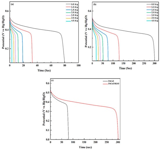 Figure 7a,b, demonstrate the electrochemical behavior of the electrodes across current densities from 0.5 to 4 A/g within a 0 to 0.5 V potential window. Notably, the discharge time and specific capacitance increased significantly from 78 s to 300 s and 74.3 F/g to 285.7 F/g (calculated using Equations (1) and (2)), respectively, representing a 283% improvement; see