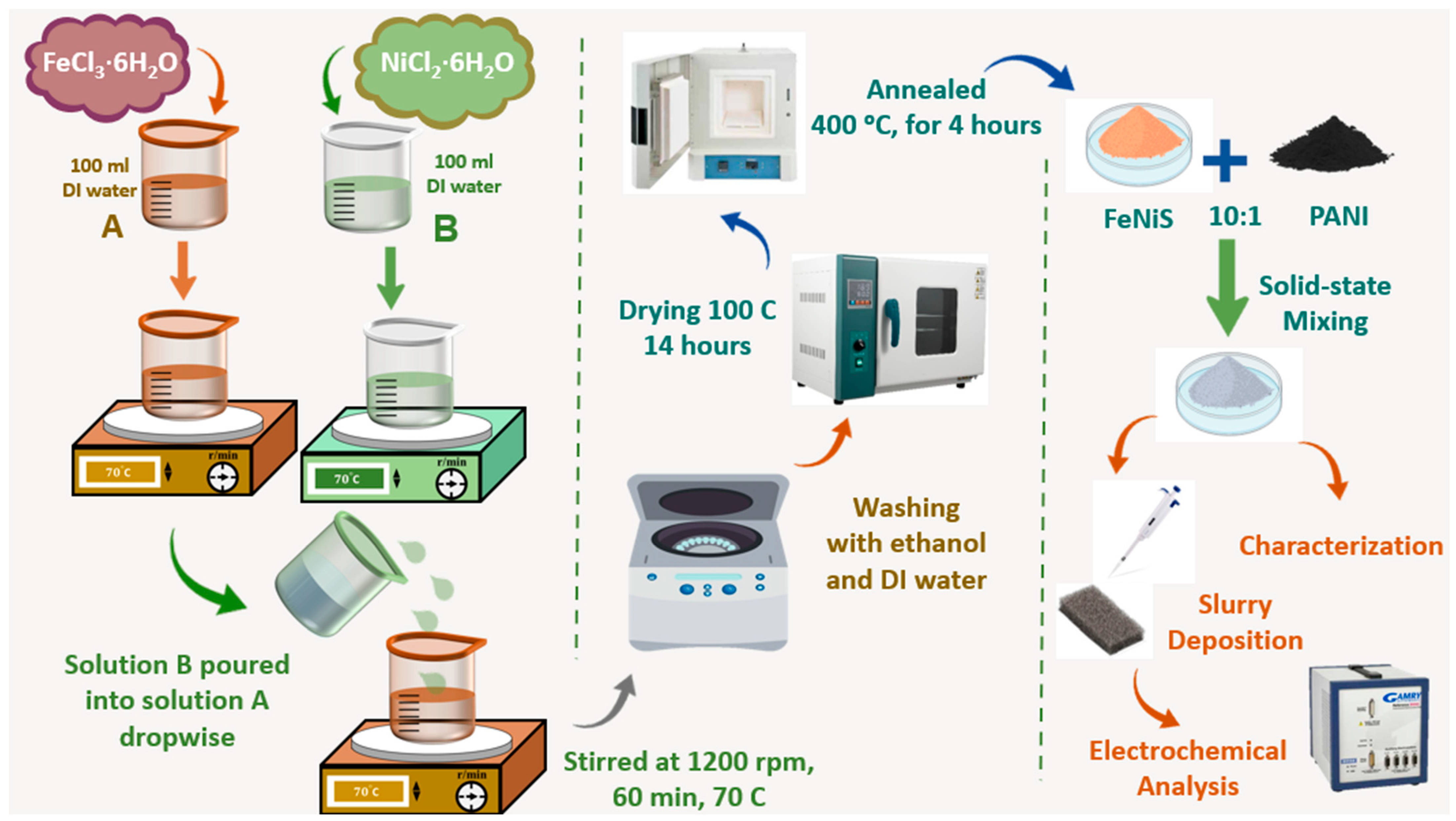 2.2. Preparation of Fe0.5Ni0.5S/PANI