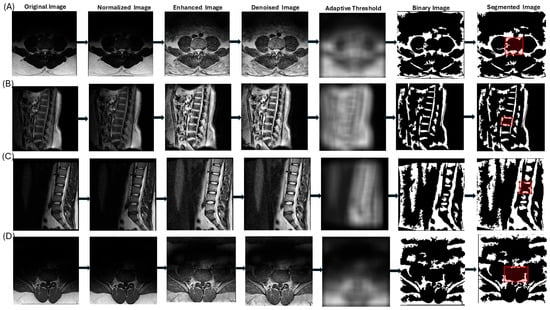 Figure 1 illustrates the step-by-step processing of images from various patients with differing anatomical features. Images A and D are captured in the coronal plane and depict only a single vertebra. In contrast, images B and C are displayed in the sagittal plane, showcasing multiple vertebrae. This difference can create challenges for automated ROI detection systems, which may struggle to identify the accurate ROI in such cases. Therefore, there is a need for a manual and interactive ROI selection system, which is utilized by the proposed system.