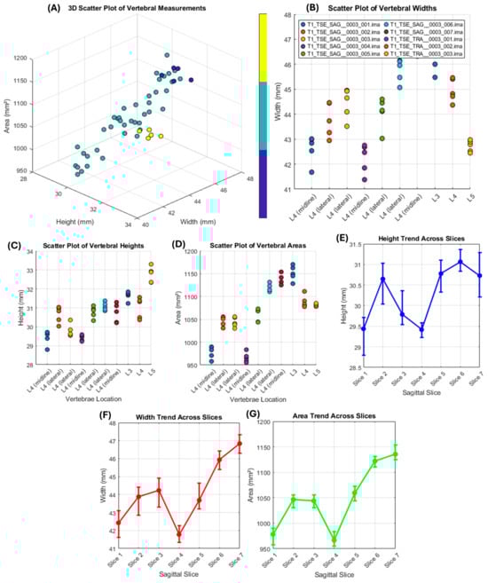 Comprehensive analysis of vertebral measurements from Lumbar Spine MRI Dataset for reproducibility assessment. (A) A 3D scatter plot of area, width, and height values tested on repeated measurements to check result reproducibility across L3, L4, and L5 vertebrae. (B) A scatter plot of vertebral widths with ±2% error variations to assess measurement consistency across slices. (C) A scatter plot of vertebral heights with ±2% error variations for reproducibility evaluation. (D) A scatter plot of vertebral areas with ±2% error variations to confirm measurement reliability. (E) The height trend across sagittal slices, with error bars for trend reproducibility. (F) The width trend across sagittal slices, with error bars to evaluate consistency. (G) The area trend across sagittal slices, with error bars for reproducibility assessment.