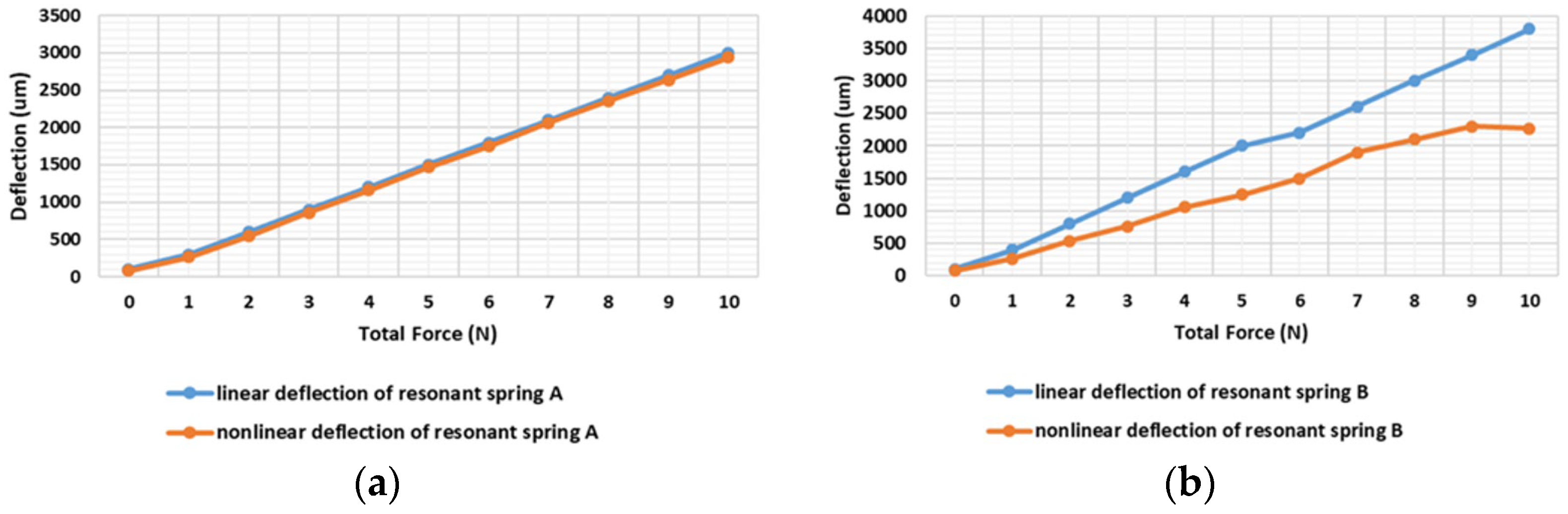 Additionally, COMSOL Multiphysics was used to compute the static deflections of the resonant springs under different loading conditions. Both “Small Displacement Static” (linear) and “Large Displacement Static” (nonlinear) simulation modes were applied to capture the linear and nonlinear responses, respectively. The relationship between the applied load and the central deflection of the resonant springs is presented in
