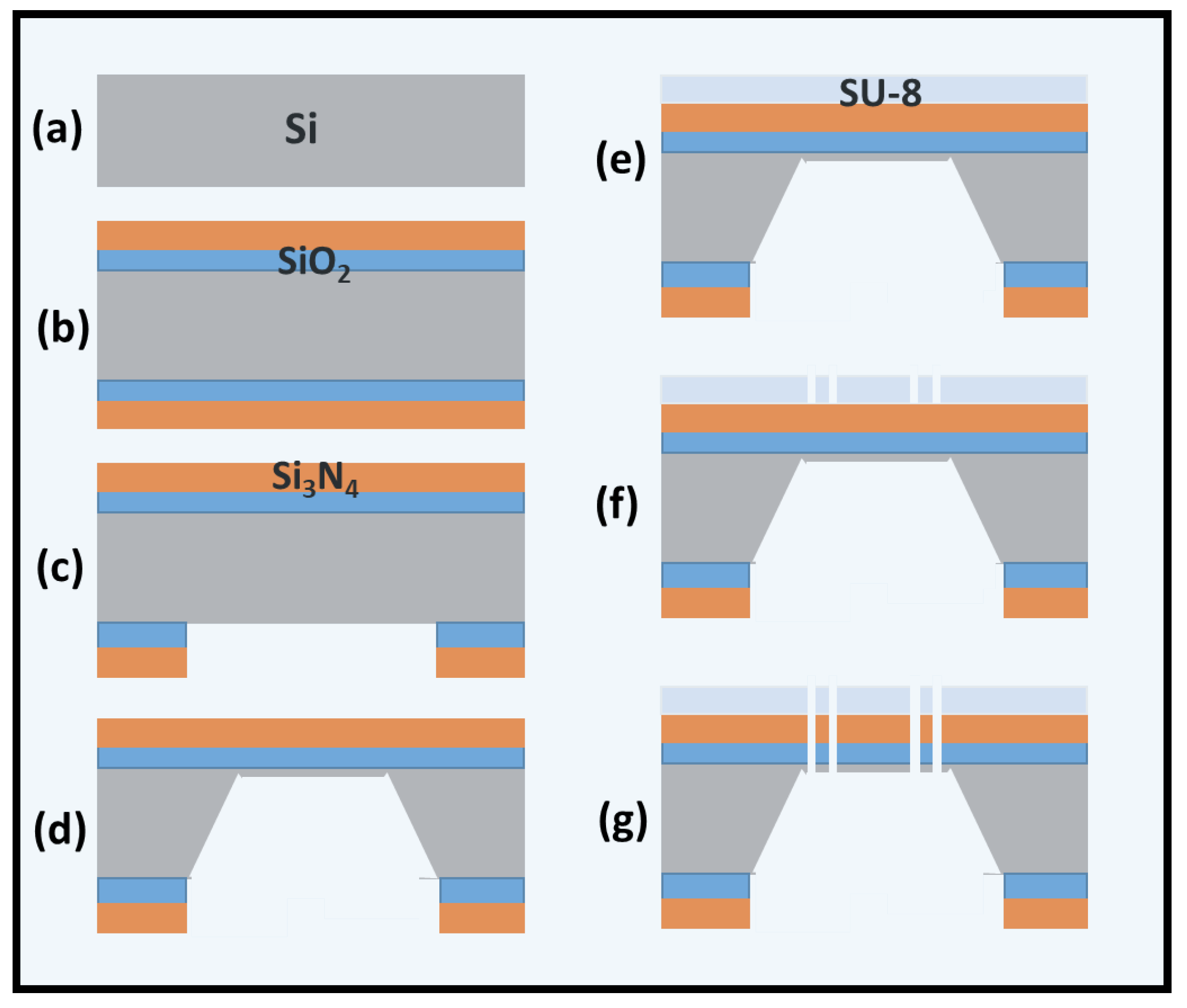 A wet thermal oxidation process was first performed to grow a silicon dioxide (SiO2) layer of approximately 0.3 μm on both sides of the wafer. Subsequently, a thin layer (~0.20 μm) of silicon nitride (Si3N4) was deposited on top of the oxide layers using low-pressure chemical vapor deposition (LPCVD). The combined SiO2/Si3N4 bilayers acted as masking and insulating layers during subsequent etching steps.