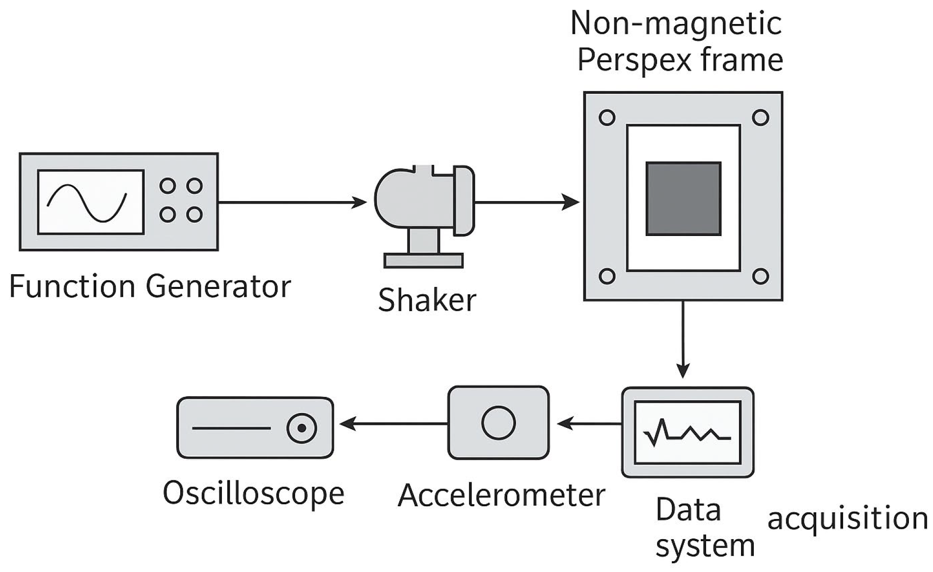 The experimental evaluation of the prototypes was performed using a dedicated vibration testing setup designed to accurately measure voltage and power output. The setup consisted of an electromagnetic shaker, a function/signal generator, an accelerometer, a data acquisition computer, and a digital oscilloscope. The micro-electromagnetic energy harvester was securely mounted in a Perspex frame, which was then fixed onto the vibration table of the shaker. The Perspex frame was intentionally chosen as a non-magnetic holder to minimize interference from the magnetic fields generated by the shaker, thereby ensuring accurate measurements.