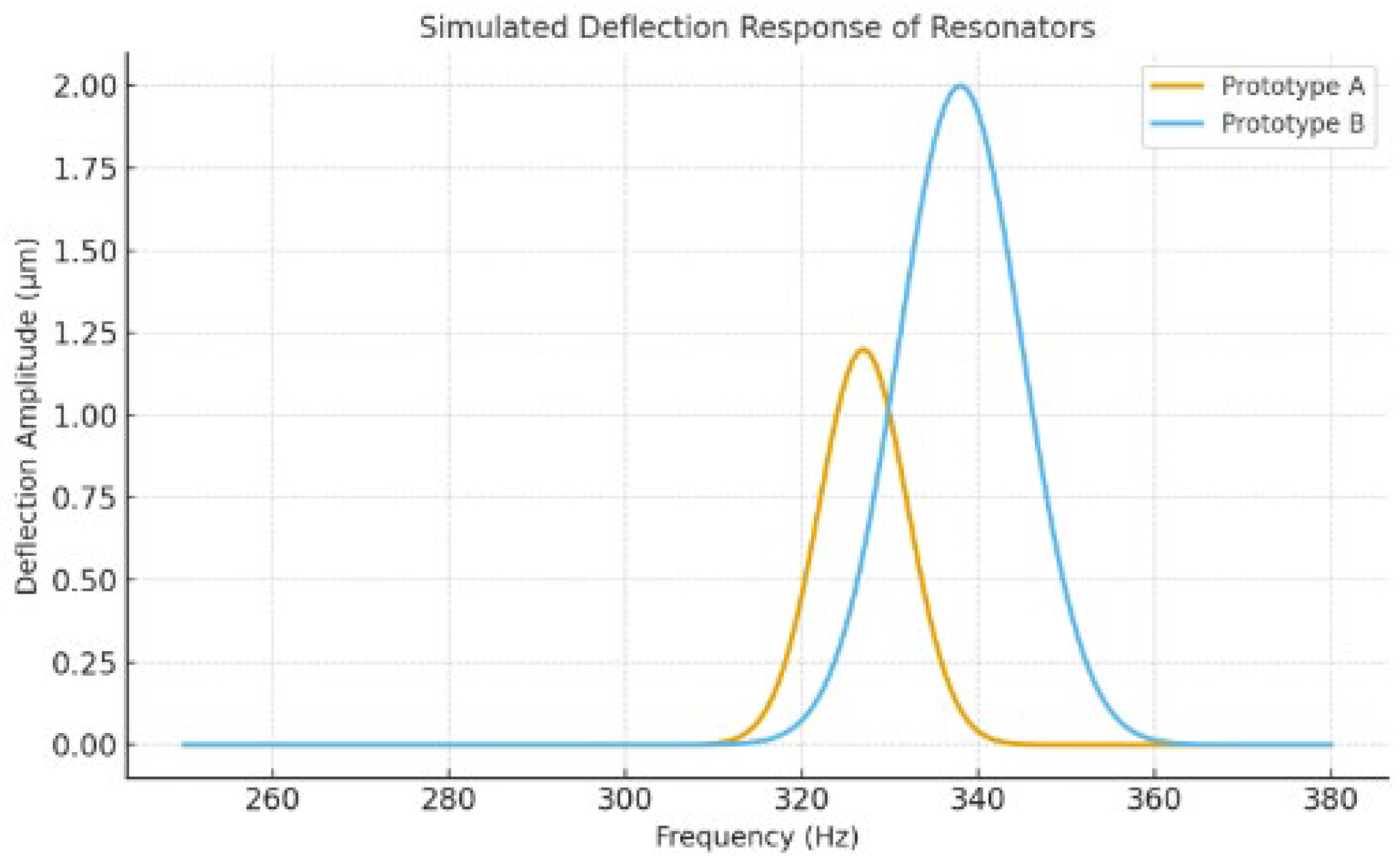 Figure 6 shows simulated deflection results of the resonators obtained using COMSOL Multiphysics. The plots show that Prototype A reaches a peak deflection near 327 Hz, while Prototype B exhibits a higher peak deflection near 338 Hz with a broader bandwidth. Although direct experimental deflection measurements were not possible due to resource limitations, these simulation results were correlated with the measured frequency-response data, providing a reliable understanding of how each resonator deforms under applied vibration loads.