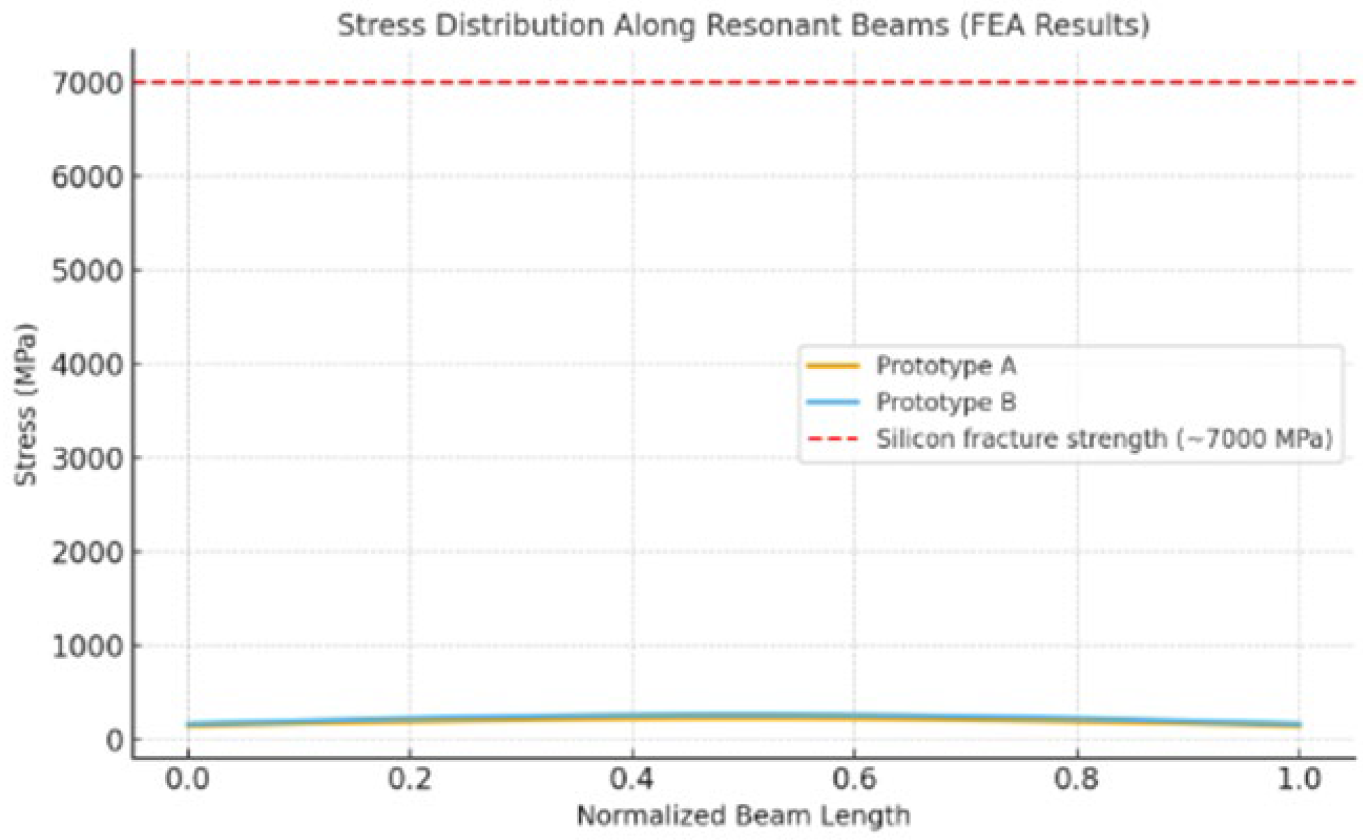 Figure 7 shows the simulated stress distribution analysis for the resonant beams of Prototype A and Prototype B. The results show that the maximum stresses remain well below the fracture strength of silicon (~7000 MPa), confirming that both devices are structurally reliable under the tested vibration conditions. Prototype B experiences slightly higher stress levels due to its greater deflection but still operates safely within material limits.