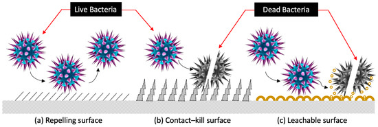 Types of antibacterial nano-treated surfaces. (a) Repelling: engineered surface textures limit cell attachment and deflect particles before adhesion. (b) Contact-kill: embedded antimicrobial coatings or micro-spikes deactivate organisms instantly on impact or touch. (c) Leachable: surface-stored antimicrobial agents release outward, creating a protective diffusion zone that suppresses microbial survival.