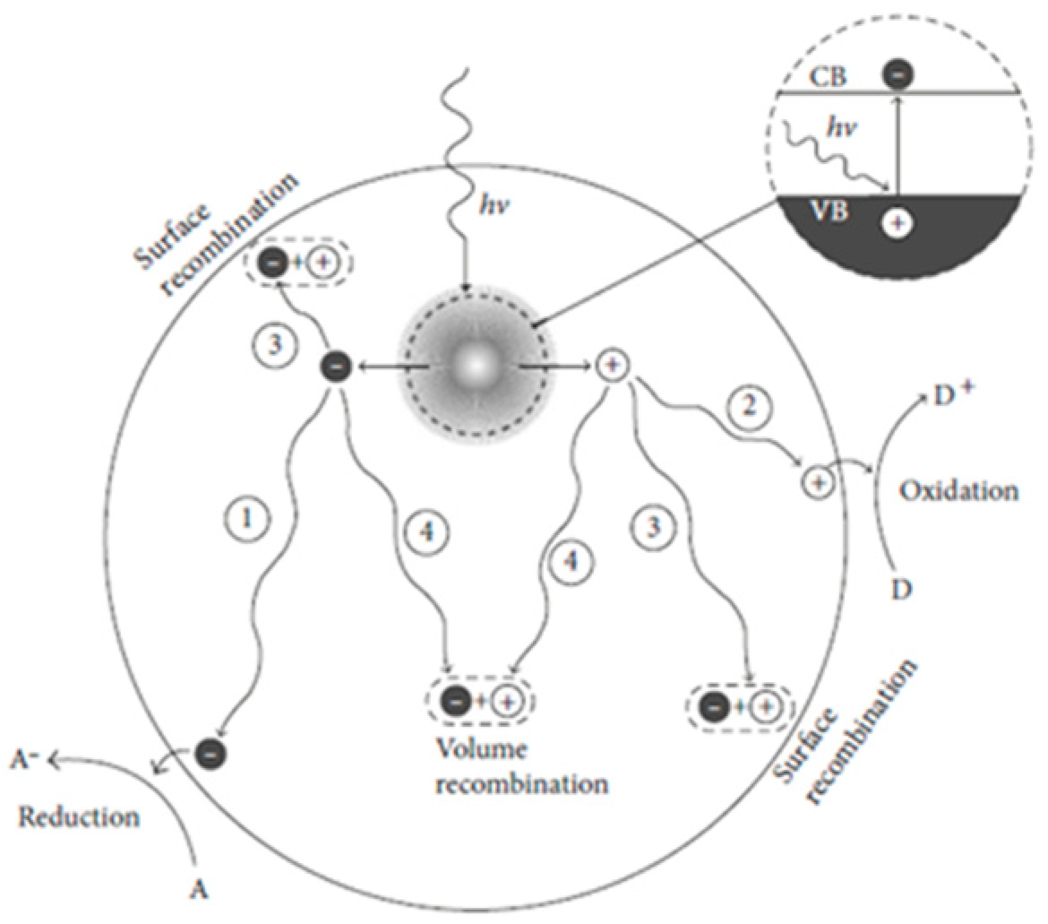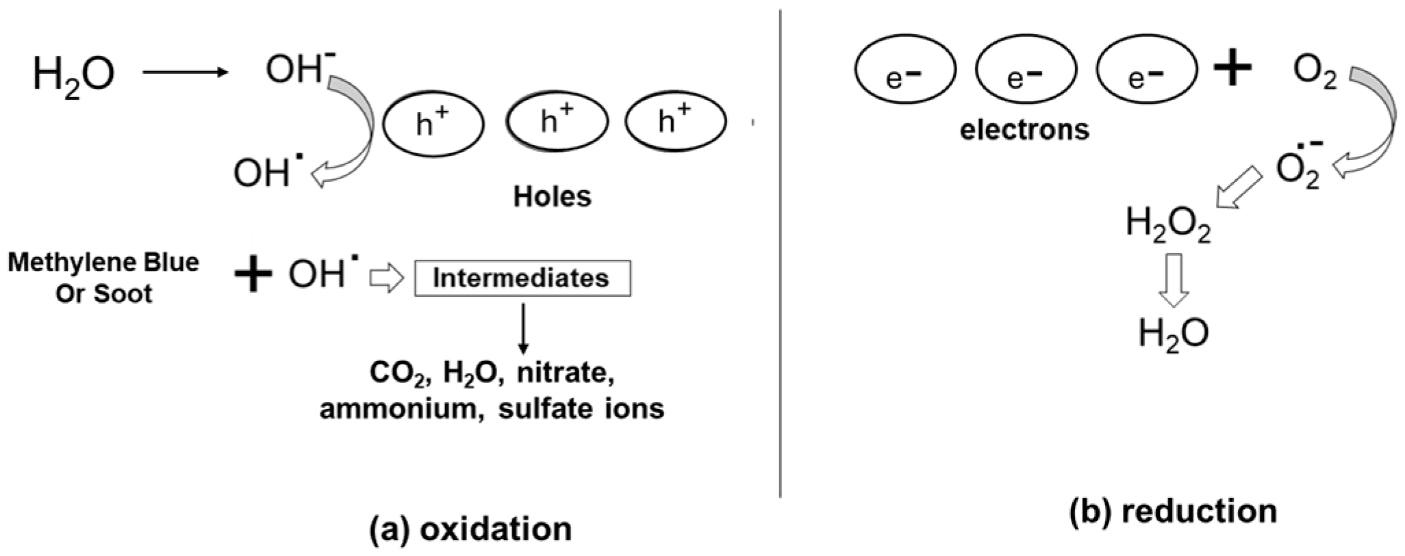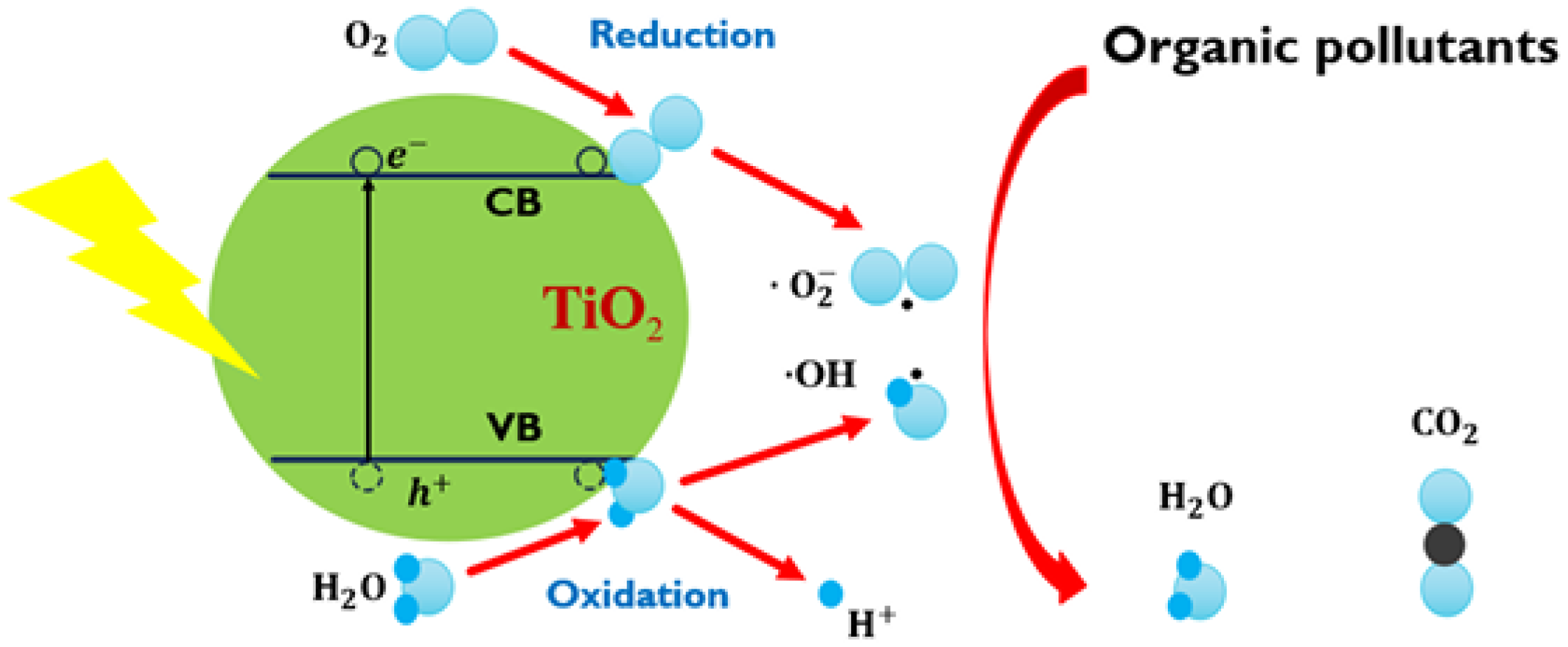 Non-recombining electrons and holes can move to the surface of TiO2 and engage in redox reactions with molecules that have been adsorbed on the surface. In Equation (2), superoxide radicals (∙O2−) or hydroperoxide radicals (HO2∙) are produced when electrons (e−) in the CB engage in reduction processes with molecular oxygen (O2):