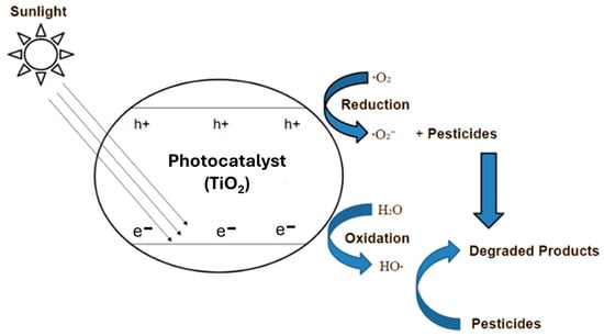 Photocatalytic oxidation using semiconductor materials like TiO2 is a light-induced process that involves the generation of reactive species capable of degrading organic pollutants and microorganisms. As the photocatalyst is exposed to UV light, its electrons become excited, creating electron–hole pairs that migrate to the surface (Figure 1). The holes react with hydroxide ions or adsorbed water and produce very reactive hydroxyl radicals, which are powerful, non-selective oxidants responsible for breaking down a wide range of organic contaminants. Simultaneously, the excited electrons reduce oxygen molecules on the catalyst surface, forming superoxide radicals. These radicals not only participate in further oxidation reactions but also help prevent reassociation of the charge transporters and maintain the performance of the process. The superoxide radicals can then undergo a series of reactions to generate additional reactive oxygen radicals, particularly hydrogen peroxide and hydroperoxyl radicals, which further decompose into more hydroxyl radicals. Together, these reactive species contribute to the full decomposition of organic contaminants and the neutralization of microbes, making the entire photocatalytic system highly effective for environmental remediation applications [4,5].