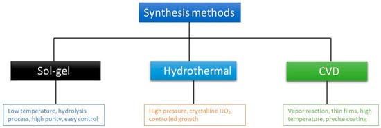 In the sol–gel method, titanium alkoxide precursors like titanium (IV) n-butoxide (TNBT) or titanium isopropoxide (TTIP) are mixed with alcohol-based solvents with continuous stirring, followed by the dropwise mixing in of acidified liquid water to initiate hydrolysis and condensation reactions, forming a TiO2 sol (Figure 2). After aging, the sol transitions into a gel, which can be dried to obtain xerogel in the form of a powder, dense ceramic, or fibers. Additives such as complexing agents or metal salts can be incorporated to enhance the material’s properties based on the intended application [6]. The sol–gel technique is highly flexible and enables accurate control over NP characteristics [7]. TiO2 NPs were synthesized via hydrothermal synthesis under an applied magnetic field. Fifty milliliters of a 0.1 M TTIP mixture was placed inside a low-temperature water bath until a temperature range of 3–5 °C was reached. Subsequently, 5.0 M KOH was incrementally mixed into the low-temperature solution until a pH of 7.0 was reached. The resulting mixture was subsequently placed into a Teflon autoclave and placed under a temperature of about 160 °C for 5 h. Then, the chemical mixture was exposed to a magnetic field. The resulting powder was dried overnight in the oven and subsequently thermally treated in air at a temperature of 500 °C for 30 min, with a heating rate of 5 °C/min [8]. Photocatalytic TiO2 thin films were deposited using a vertical low-pressure CVD reactor designed as a custom cold-wall system. The titanium and oxygen sources were TTIP and oxygen gas (O2), respectively. The deposition temperature was varied between 287 °C and 362 °C, while the operating pressure was maintained at 1 Torr. Argon was employed as the carrier gas for TTIP, with flow rates of 80 cm3·min−1 for Ar and 10 cm3·min−1 for O2. The TTIP delivery rate was maintained at 4.464 × 10−5 mol·min−1. The microstructural properties of the deposited TiO2 films were characterized by X-ray diffraction (XRD) using Cu Kα radiation operated at 40 kV and 20 mA. The surface morphology and cross-sectional structures of the films were examined using scanning electron microscopy (SEM). The photocatalytic degradation of benzene was evaluated using 10 × 10 cm2 TiO2-coated glass substrates placed in a quartz reactor with an internal volume of 610 mL. The experiments were carried out under UV illumination (Sankyo BLB lamp, λ = 365 nm) with an intensity of 0.71 mW·cm−2 at ambient temperature. The initial benzene concentration in the reactor was approximately 120 ppm.
