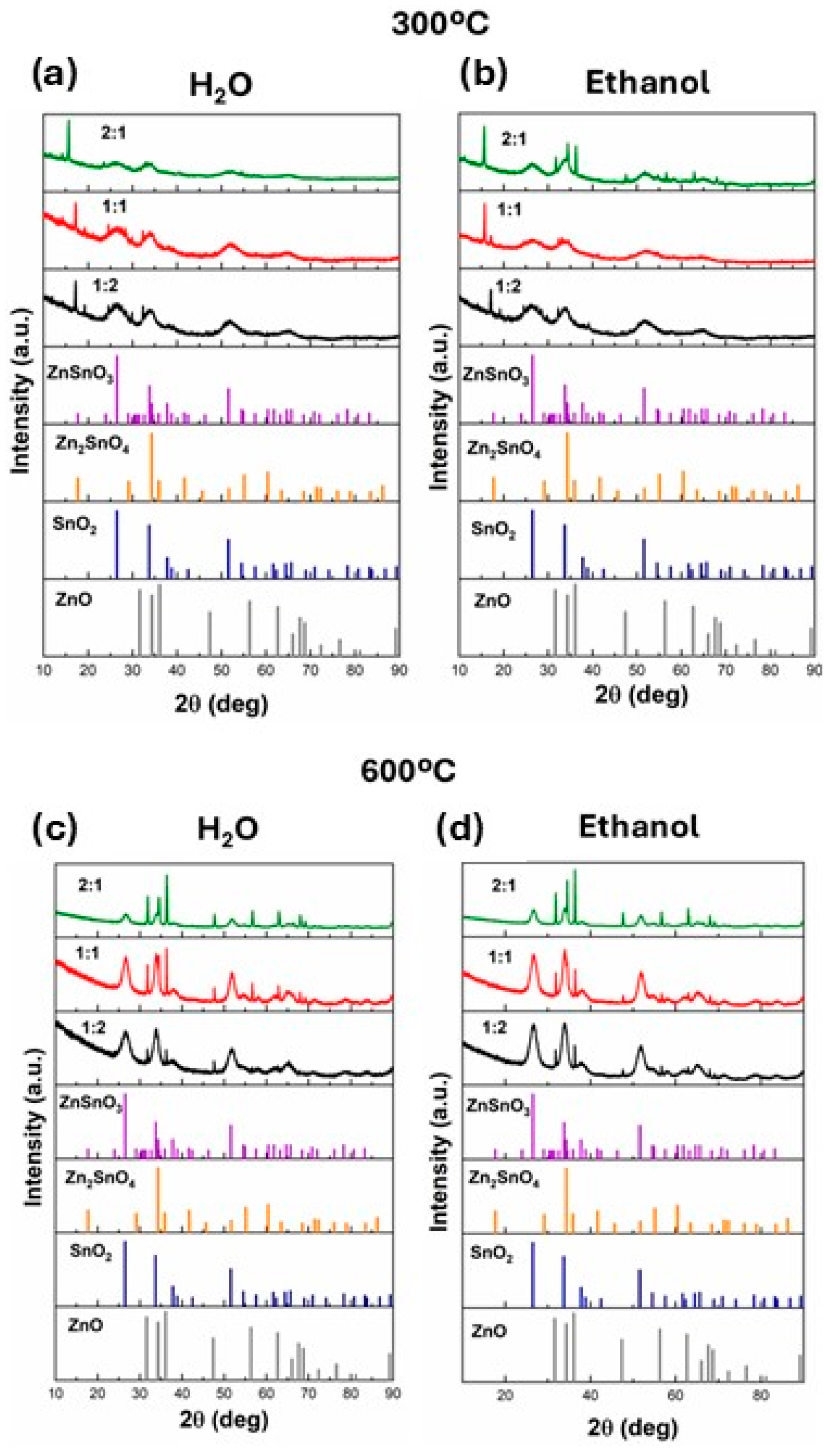 XRD patterns for different Zn:Sn ratios (1:2, 1:1, 2:1) for nanostructures produced using water (a,b), and ethanol (c,d) as solvents after synthesis at 300 °C and annealing at 600 °C. ICDD cards: ZnO 01-079-0208, SnO2 01-077-0452, ZnSnO4 00-024-1470 and Zn2SnO3 00-028-1486 (deleted).