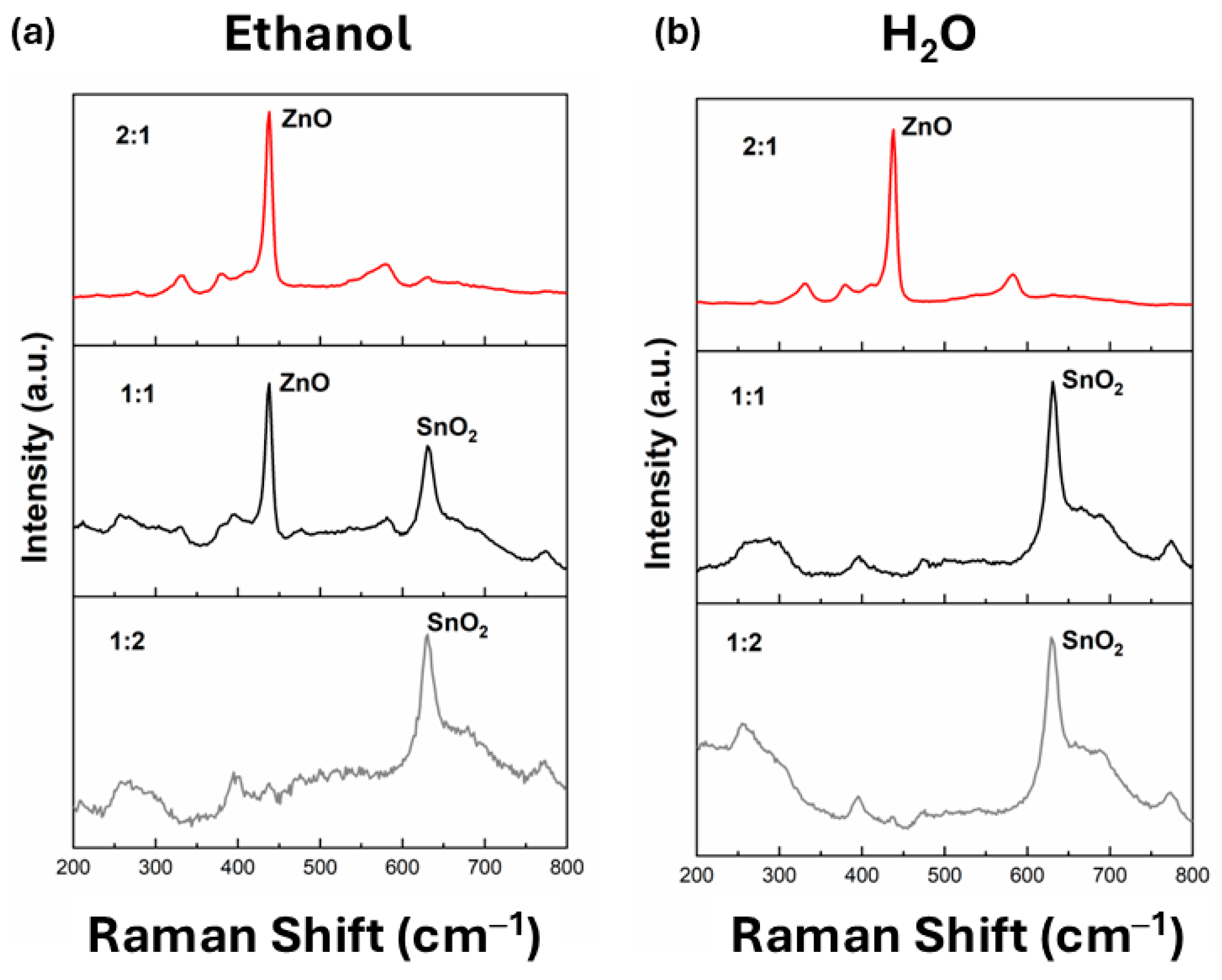 Raman shift for different Zn:Sn ratios (1:2, 1:1, 2:1) for ZTO nanostructures produced with (a) ethanol and (b) water.