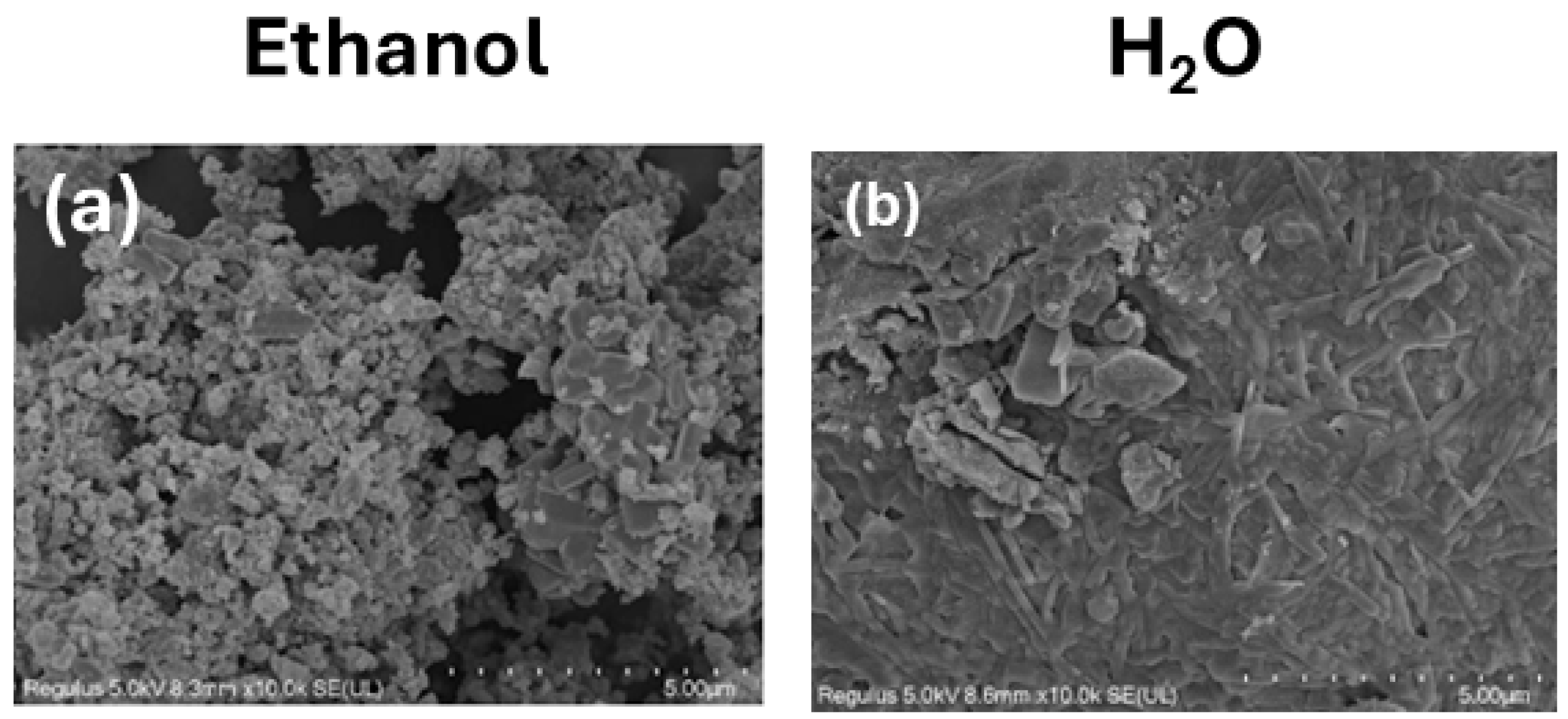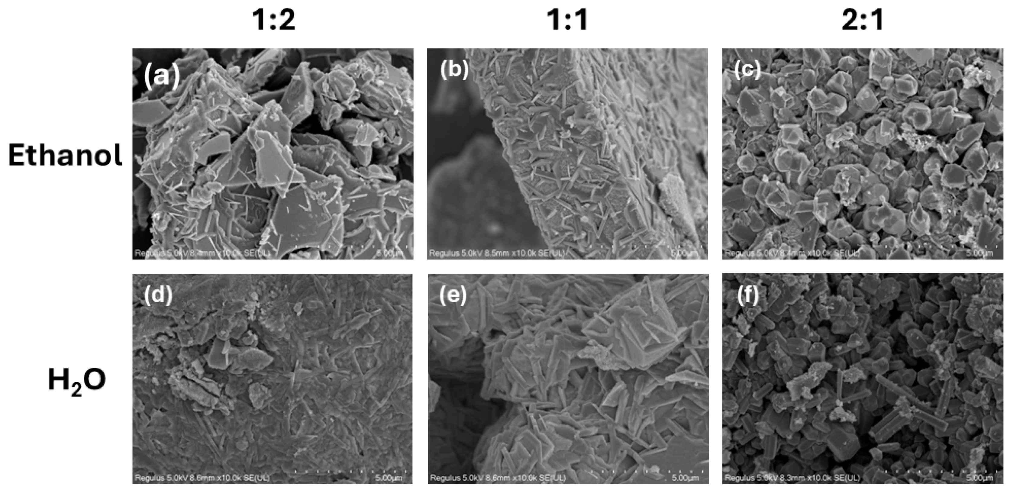 Figure 3. The samples produced with ethanol presented a nanoplate shape for a 1:2 ratio and lost well-defined structures as the ratio increased to 2:1. The samples produced with water appeared to have some nanowires for a 1:2 ratio, which turned into nanoplates for a 1:1 ratio. For a 2:1 ratio, the water samples appeared to have some nanowires mixed with octahedrons.