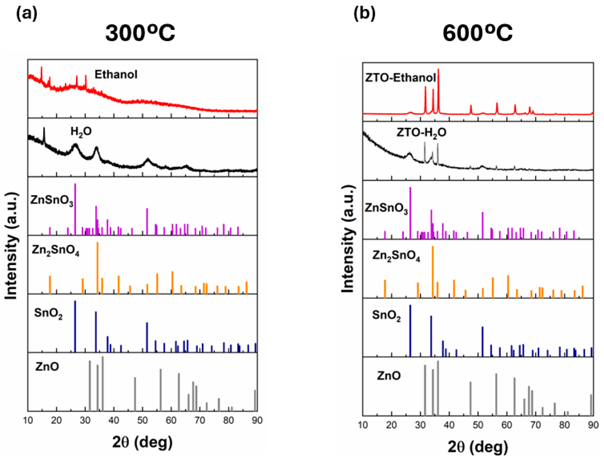 To understand the Zn:Sn ratio’s influence on the properties of the ZTO powders, two different solvents (ethanol and water) were used to produce ZTO powders with different ratios (1:2, 1:1, 2:1). After synthesis at 300 °C, the samples produced with water,