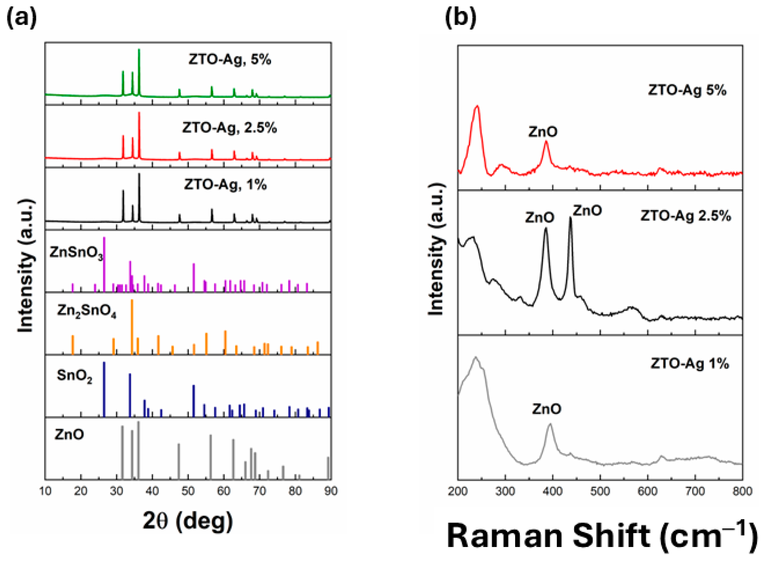 (a) XRD patterns of ZTO-Ag-doped nanostructures with different doping percentages (1%, 2.5% and 5%). ICDD charts: ZnO 01-079-0208, SnO2 01-077-0452, ZnSnO4 00-024-1470, and ZnSnO3 00-028-1486 (deleted); (b) Raman shift for ZTO-Ag-doped nanostructures for doping percentages of 1%, 2.5% and 5%.
