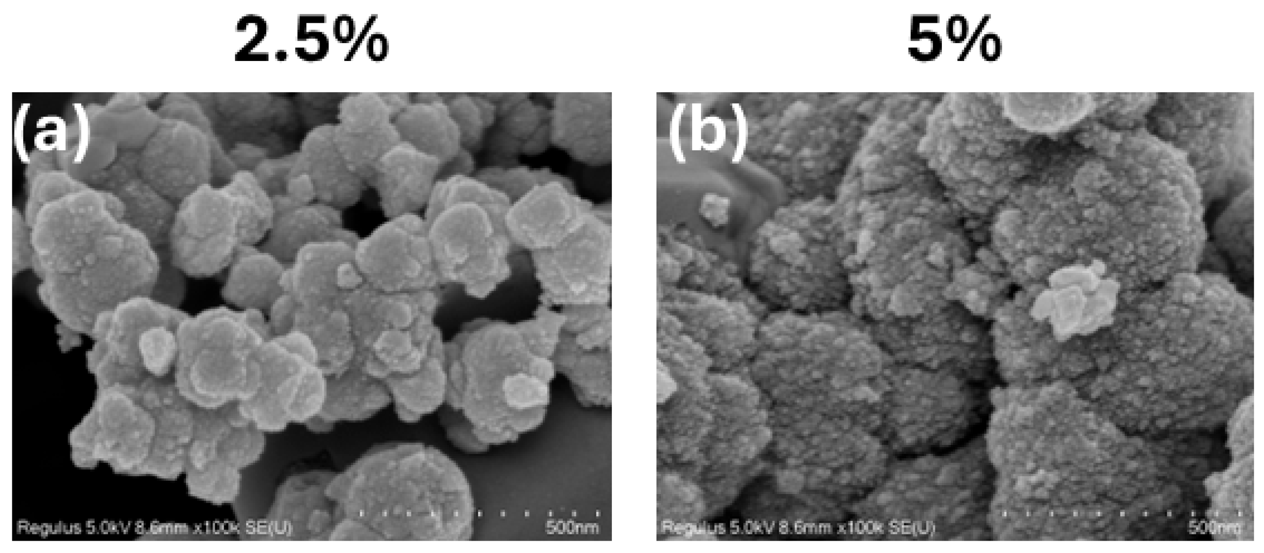 SEM images of the ZTO-Ag-doped nanostructures for the different (2.5% and 5%) doping percentages are shown in