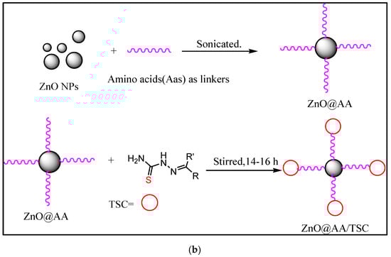 In this method, ZnO NPs are functionalized by the ultrasonication method using suitable linkers, such as amino acids, silanes, thiols, etc. After that, ligands are attached through adsorption, electrostatic interaction, or covalent coupling. This gives greater control of ligand stoichiometry and orientation [30]. Generally, the mixture is sonicated for around 45–60 min and then stirred for around 14–16 h at a pH of 7–8. The ultrasonication-assisted synthesis of ZnO/TSC conjugates is represented in Figure 2.