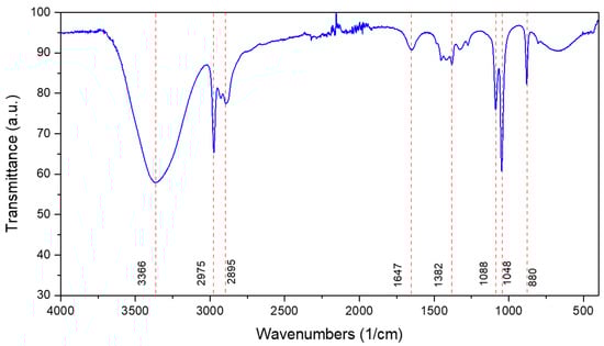 The chemical composition of spearmint extract was identified by FTIR spectroscopy [36]. Figure 2 reveals characteristic absorption bands of functional groups and compounds present in the extract, such as alcohols and alkanes. The most relevant peaks include a band around 3360 cm−1, attributed to O–H groups of phenolic compounds or water; bands between 2975 and 2895 cm−1, associated with C–H bonds, present in compounds such as carvone and limonene [26,37], and C–H2 and C–H3 groups, due to the presence of chlorophyll [38]; and a peak near 1647 cm−1, typical of C=O groups, corresponding to carbonyls in essential oils or acid derivatives [39]. Other peaks were found between 1400 and 800 cm−1, related to C=C and C–O bonds, which are common in plant metabolites [40]. These results are consistent with the chemical composition reported for spearmint, highlighting the presence of chlorophyll, polyphenols, and other active compounds [41].
