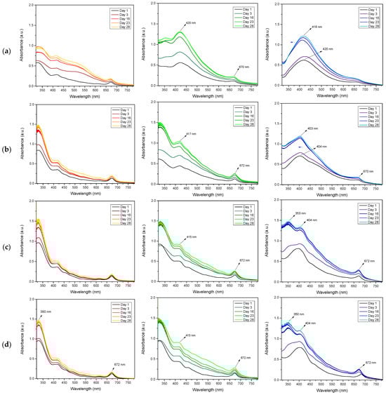 UV-vis spectra of Ag-nps fabricated using row (a) 2%, row (b) 3%, row (c) 4%, and row (d) 5% of HB-E. It also shows the variation in pH: Red for pH 5, Green for pH 7, and Blue for pH 9.