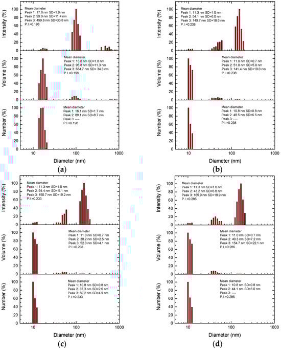 Mean diameter by DLS of Ag nps fabricated using (a) 2%, (b) 3%, (c) 4% and (d) 5% of HB-E. All samples reach pH 9.