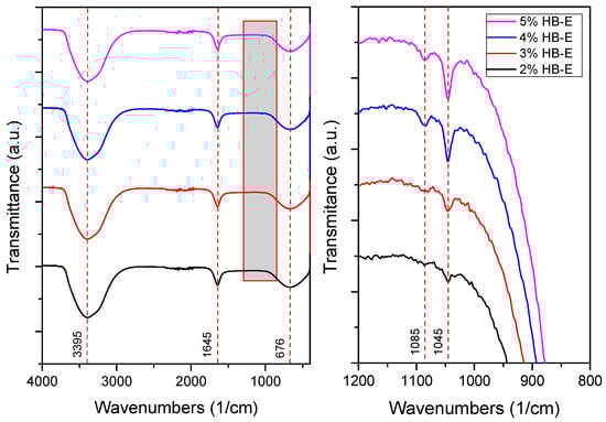 Figure 5 shows the FTIR spectra of Ag-nps synthesized with spearmint extract at different concentrations. Three main peaks are observed—one at 3395 cm−1, attributed to OH groups (such as alcohols, phenols or adsorbed water); another at 1645 cm−1, associated with C=O (carbonyl) or C=C (alkene) bond vibrations present in the organic compounds of the extract [38,40]; and a third at 676 cm−1, which is possibly related to Ag-O vibrations. A comparison of the FTIR spectrum of silver nanoparticles (Figure 5) with that of spearmint extract (Figure 2) reveals the absence of some peaks containing bands such as C–H, C≡C, and C–O associated with functional groups such as polyphenols and flavonoids present in Mentha spicata extract, indicating their participation in the synthesis of silver nanoparticles, responsible for the reduction and stabilization [22,26]. In the broadened region (1200–800 cm−1), the peak at 1045 cm−1, whose intensity increases with the concentration of HB-E, can be assigned to vibrations of C–O bonds (ethers, secondary alcohols or polysaccharides) or C-N groups (amines), present in the extract, confirming the presence of organic residues adsorbed on the nanoparticles. These findings correlate with UV-vis and DLS analyses, where a 2% concentration of HB-E produced nanoparticles of 16.1 nm with a defined plasmon peak at 418 nm, whereas higher concentrations generated smaller particles (~11 nm) but with less defined UV-vis spectra, likely due to excess organic compounds affecting dispersion and colloidal stability. This suggests that although higher extract concentrations reduce the size, they may compromise the optical quality of the nanoparticles, highlighting the need to optimize the extract ratio to balance size, functionality, and optical properties [26].